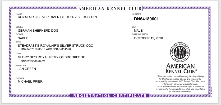 Royalair’s Silver River of Glory Be C.G.C & TKN, Rare Silver Sable.
